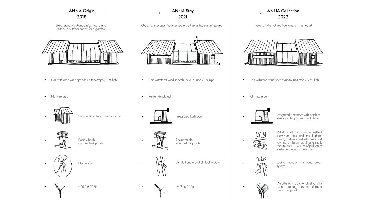 At the heart of ANNA’s design lies a patented rail system that ensures smooth movement while offering robust protection against the elements. A unique combination of a wind labyrinth, integrated brushes, and rubber seals forms a weather-tight seal between the structure’s moving layers, keeping nature at bay when needed, and inviting it in when desired.